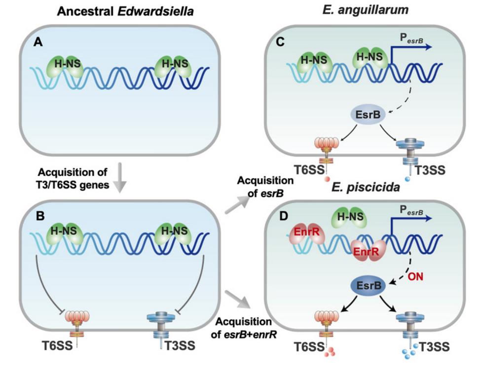 Recently, the research group of Professor Qi Wang of the School of Bioengineering, ECUST, has made new progress in the regulation mechanism of Edwardsiella fischeri virulence. The related research article was published recently in Nucleic Acids Research, a well-known academic journal of biology and molecular science, with the title of “Xenogeneic nucleoid-associated EnrR thwarts H-NS silencing of bacterial virulence with unique DNA binding”.